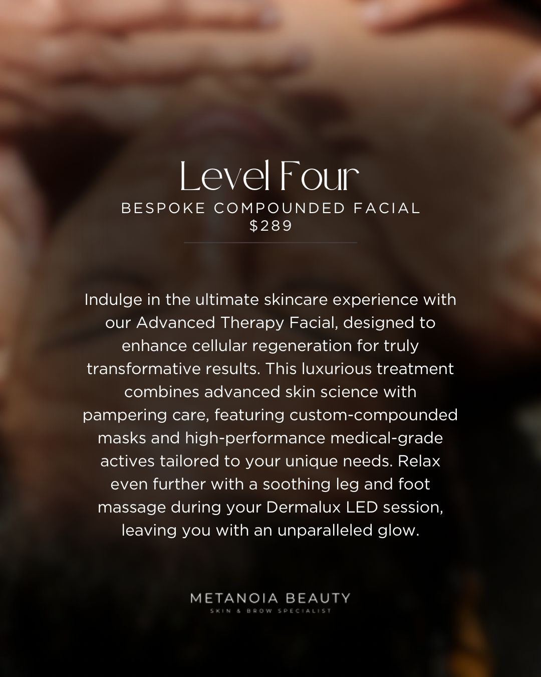 Indulge in the ultimate skincare experience with our Advanced Therapy Facial, designed to enhance cellular regeneration for truly transformative results. This luxurious treatment combines advanced skin science with pampering care, featuring custom-compounded masks and high-performance medical-grade actives tailored to your unique needs. Relax even further with a soothing leg and foot massage during your Dermalux LED session, leaving you with an unparalleled glow.